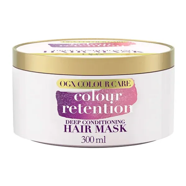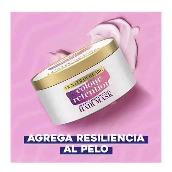 La OGX Retención de Color, Mascarilla Capilar Hidratante con Tecnología Bond Plex está diseñada para ser una mascarilla para el cabello profundamente acondicionadora que ayuda a suavizar y fortalecer las hebras dañadas y prolonga el color hasta 4 semanas. Esta mascarilla para el pelo teñido ayuda a dar suavidad y un color brillante que dura. La tecnología Color Bond Plex está creada para evitar el daño de los rayos UVA y UVB.
