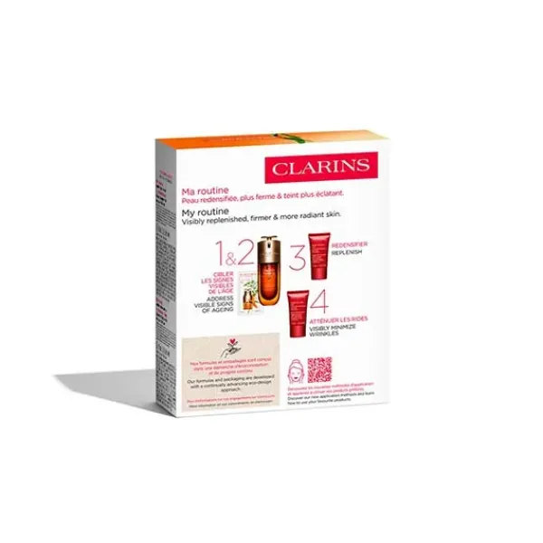 El cofre de tratamientos redensificantes para las pieles debilitadas por los cambios hormonales de la edad: el mítico Double Serum con 27 extractos de plantas y un dúo de cremas antiedad de día y noche redensificantes y alisadoras formuladas con extracto de harungana. Día tras día, la piel del rostro está más lisa, redensificada, los contornos se remodelan y las arrugas se atenúan visiblemente. Para la mirada, Double Serum Eye ayuda a reducir las arrugas y patas de gallo y reafirmar la delicada piel del contorno de los ojos para una apariencia más joven y revitalizada.