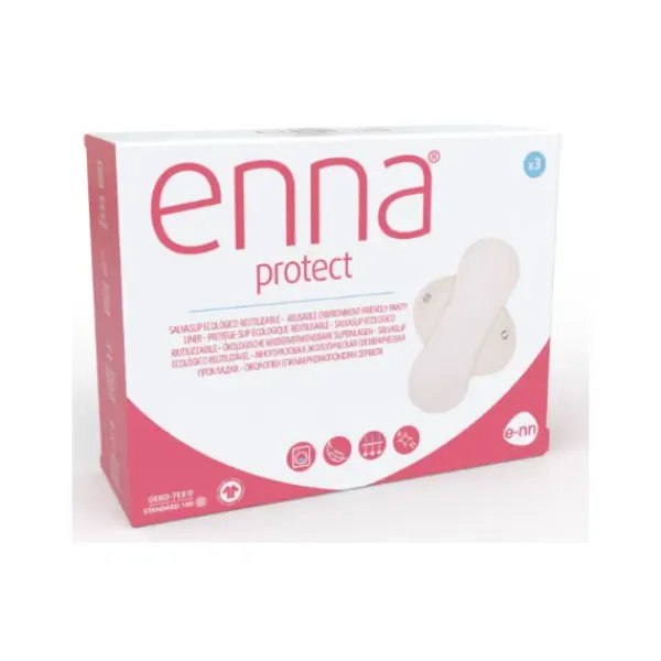 Salvaslip ecológico, reutilizable, con alas, diseñado para completar la higiene íntima, con un producto saludable y sostenibles. Enna Protect es transpirable y contien una capa con compuesto de silicio, que tiene actividad antimicrobiana y neutraliza las bacterias y hongos que pueden causar cistitis, vaginosis y candidiasis. Es absorbente, gracias al tejido 3D space de microfibra PA (OEKO-TEX).