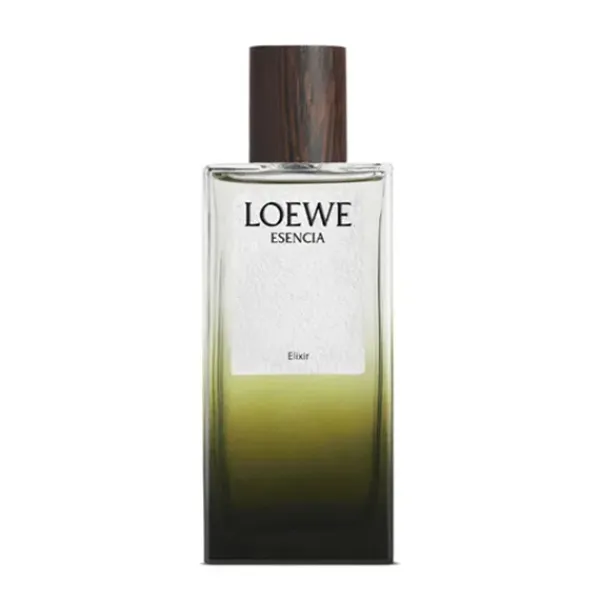 LOEWE Esencia Elixir EDP aparece encapsulado en un frasco de vidrio translúcido con un degradado verde, haciéndose eco del frasco de la fragancia original, culminado por un tapón de madera wengué.