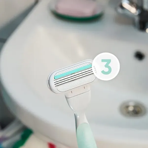 La maquinilla Venus cuenta con almohadillas protectoras en torno a las tres hojas para una depilación suave y apurada.