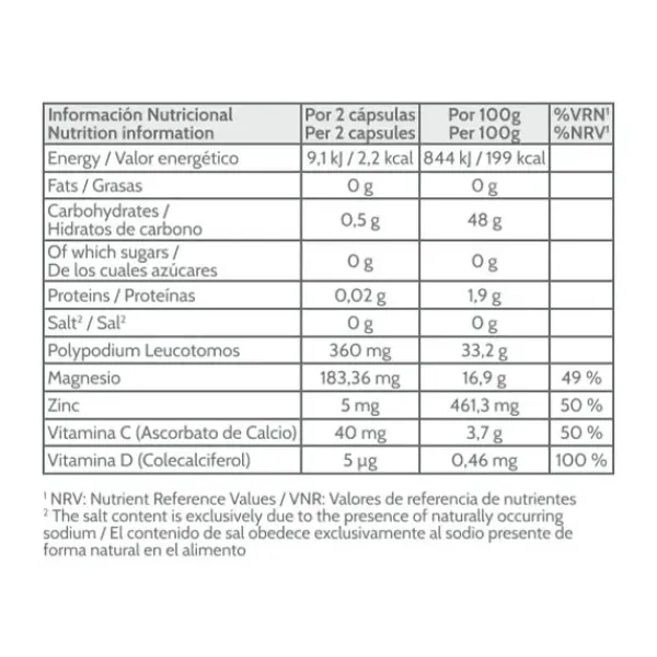 Contiene además vitaminas y minerales como el Magnesio que contribuye al funcionamiento normal de los músculos y a disminuir el cansancio y la fatiga; Vitamina D que contribuye al mantenimiento de los huesos en condiciones normales; Zinc y Vitamina C que contribuyen a la protección de las células frente al daño oxidativo y adicionalmente, la Vitamina C también contribuye al funcionamiento normal del sistema inmunitario durante y después del ejercicio físico intenso. Vegana, sin gluten, sin lactosa.
