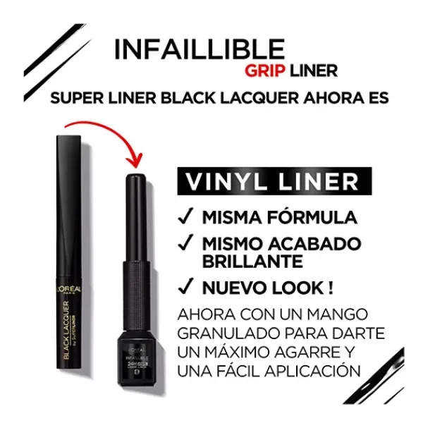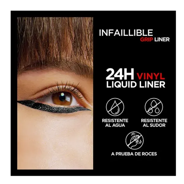 Luce una mirada espectacular con el delineado más negro y más brillante con el nuevo Infaillible Liquid Liner Vinyl Black 24hr con Acabado Ultra Brillo de L'Oréal París y crea los looks más atrevidos con su nuevo mango granulado, su punta flexible y una fórmula que resiste al agua, al sudor y a los roces hasta 24 horas.