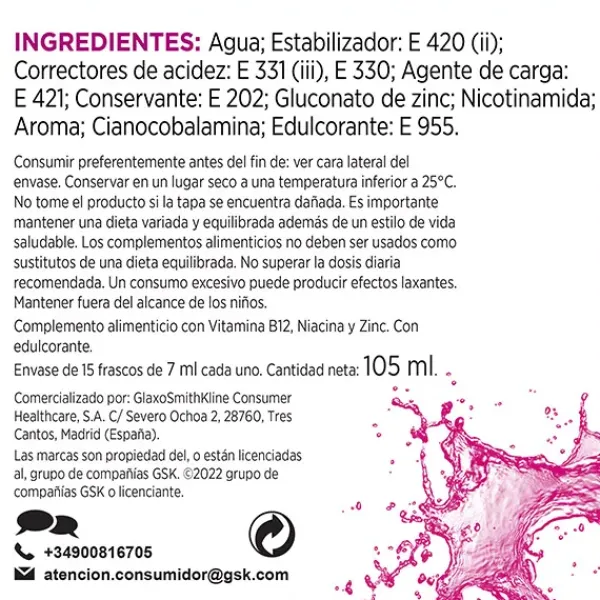 Complemento alimenticio que ayuda a disminuir el cansancio y la fatiga así como al metabolismo energético normal, funcionamiento normal del sistema nervioso y a la función cognitiva.