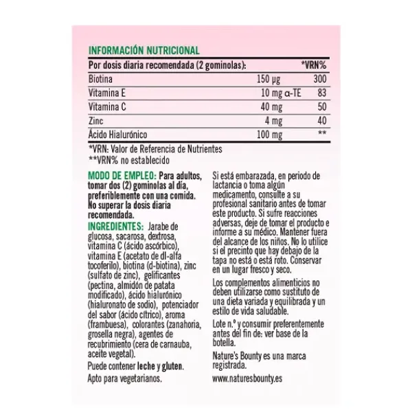 La vitamina C contribuye a la formación normal de colágeno para el funcionamiento normal de la piel, el zinc y la biotina contribuyen al mantenimiento normal de la piel