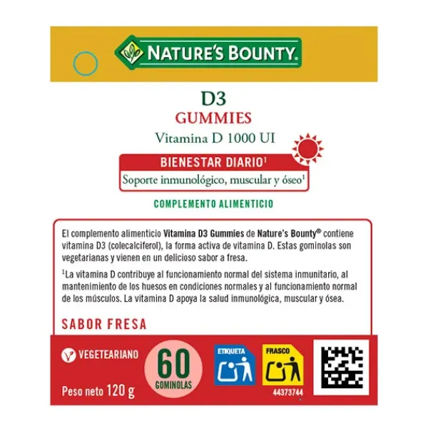 El complemento alimenticio Vitamina D3 Gummies de Nature´s Bounty® contiene vitamina D3 (colecalciferol), la forma activa de la vitamina D. La vitamina D apoya la función inmune, muscular y ósea (1,2,3).