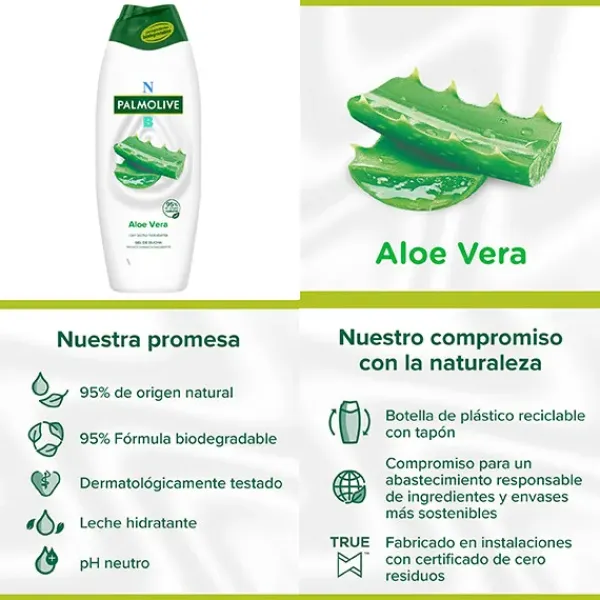 Gel de Ducha Aloe Vera de NB Palmolive: Es un gel para todo tu cuerpo en crema que nutre, hidrata y limpia proporcionado una piel suave, cuidada y saludable. Contiene aloe vera que aporta propiedades muy beneficiosas para el cuidado de tu piel y un efecto calmante maravilloso.