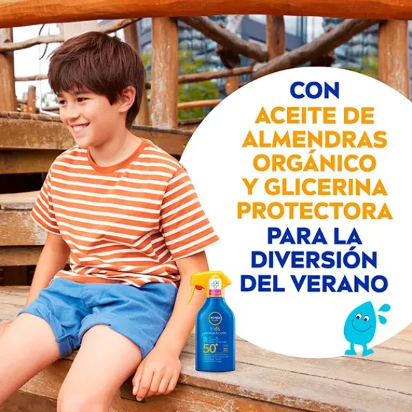 NIVEA SUN Kids Protege & Cuida Spray Solar FP50+ proporciona una protección UVA/UVB inmediata y altamente eficaz contra las quemaduras solares y daños en la piel a largo plazo. Su fórmula, especialmente desarrollada para la delicada piel de los niños, fortalece la barrera protectora de la piel y proporciona hidratación duradera, ayudando a reducir el riesgo de alergias solares.