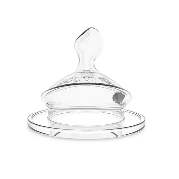 Composición: silicona médica. La tetina anatómica simula la forma del pezón materno durante la succión, adaptándose perfectamente al paladar y permitiendo su desarrollo sano y natural.