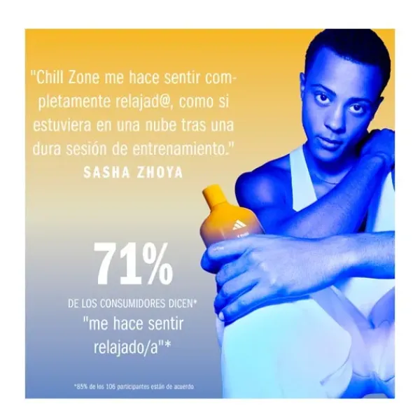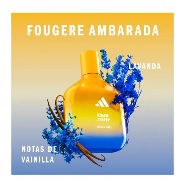 Está demostrado que el perfume Adidas Vibes Chill Zone transmite energía positiva*. Gracias a sus suaves y especiadas notas de lavanda y vainilla, podrás relajarte y aumentar tu nivel de confort.