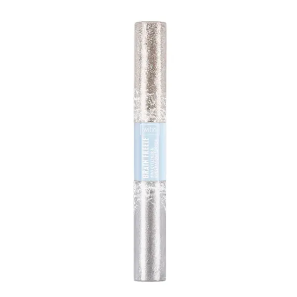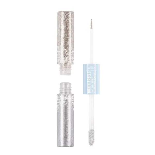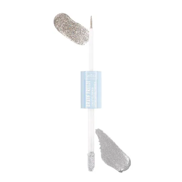 Un producto 2 en 1: un delineador de ojos con purpurina que proporciona un efecto de brillo multidimensional, y una sombra de ojos plateada de textura cremosa.