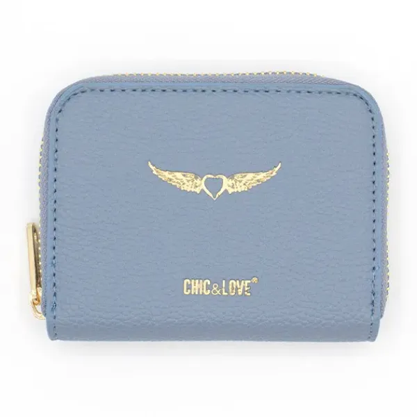 Cartera de cremallera efecto piel con detalles dorados en color azul.