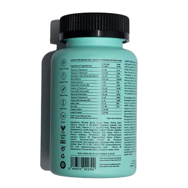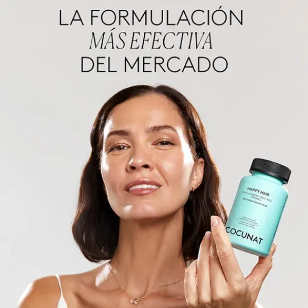 HAPPY HAIR es el nutricosmético con la concentración de activos más potente del mercado. La formulación de este complemento vitamínico de 15 activos clínicos 100% naturales y veganos está científicamente diseñada para aportar lo que tu cabello necesita para recuperar su fuerza.