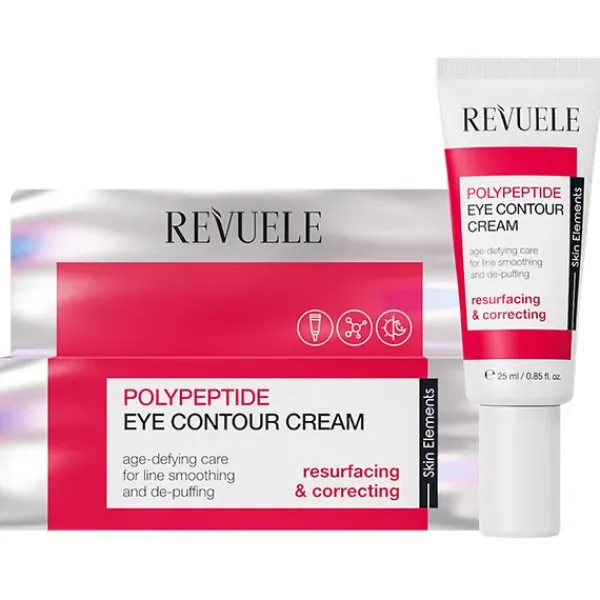REVUELE POLYPEPTIDE EYE CONTOUR CREAM es un producto antiedad de acción múltiple que trabaja para refinar visiblemente la textura de la piel en el área de los ojos y al mismo tiempo combatir las bolsas. La fórmula combina múltiples moléculas de péptidos con cafeína para suavizar activamente las líneas finas, tonificar y levantar la piel para un efecto renovador visible.