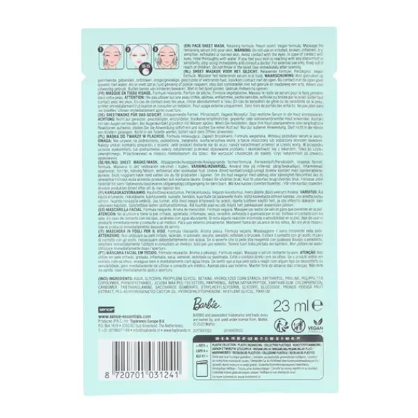Esta mascarilla facial Sence Barbie cuenta con una fórmula relajante que transforma su piel estresada en una piel luminosa y calmada.