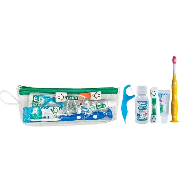 El pack GUM® JUNIOR es ideal es ideal para utilizar fuera de casa, en el colegio o en el campamento. Incluye lo necesario para una rutina de cepillado completa: aplicador de hilo dental GUM EASY-FLOSSERS, cepillo, y una pasta de dientes y colutorio de viaje GUM JUNIOR ideal para niños de 6 años en adelante, además de un cómodo estuche para transportarlo todo.