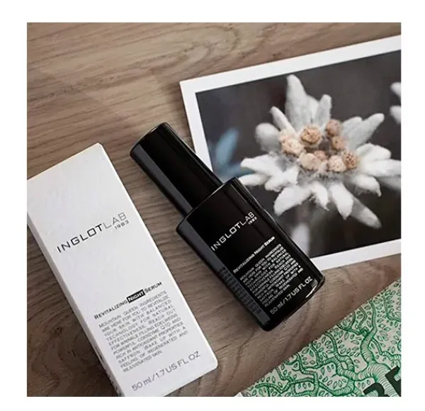 El Sérum revitalizante de noche INGLOT regenera intensamente, hidrata y, gracias al extracto del edelweiss, deja la piel más tersa y nivela ópticamente pequeños surcos y arrugas.
