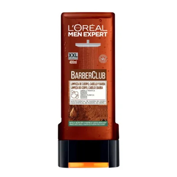 L'Oréal Paris gel de ducha Barber Club de L'Oreal Men Expert formulado con aceite de madera de cedro para proporcionar una limpieza, nutrición e hidratación de barba, piel y pelo.