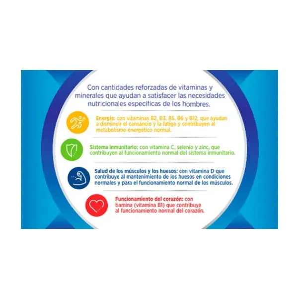 Fórmula epecíficamente equilibrada con cantidades reforzadas de vitaminas y minerales que ayudan a satisfacer las necesidades nutricionales de los hombres.