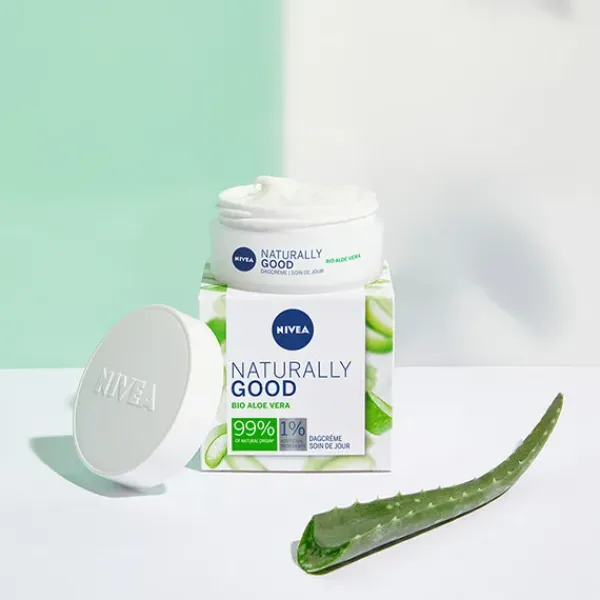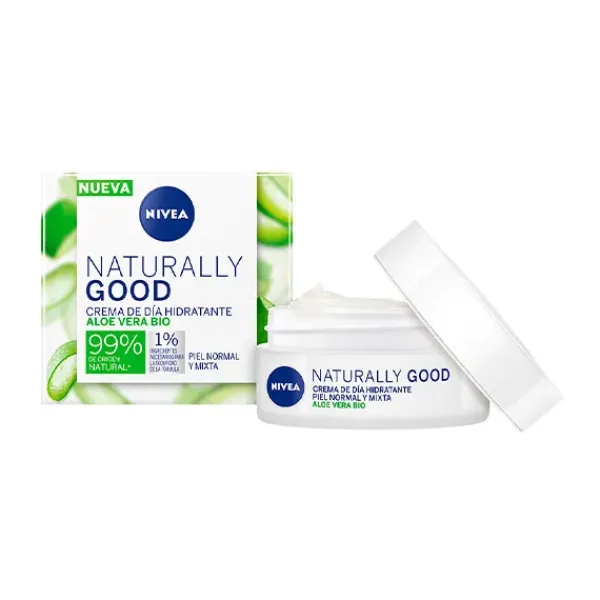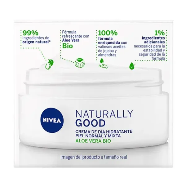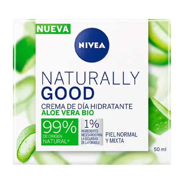 NIVEA Naturally Good Crema de Día Hidratante, con Aloe Vera BIO, hidrata la piel durante 24h, dejando una sensación de frescor, y una piel radiante y de aspecto saludable.