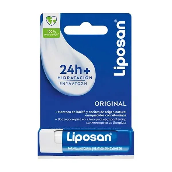 Liposan Original: Cuida y mantiene tus labios suaves todo el día, protegiéndolos frente a la sequedad. Su nueva fórmula mejorada está elaborada con ingredientes de origen 100% natural y Manteca de Karité de origen ético, enriquecida con aceites naturales y vitaminas.
