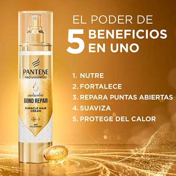 UN PELO MÁS FUERTE Y SALUDABLE con Molecular Bond Repair de Pantene; las perlas Nutri Pro-V se disuelven al instante, liberando nutrientes en profundidad; para obtener mejores resultados, combínala con toda la gama Molecular Bond Repair