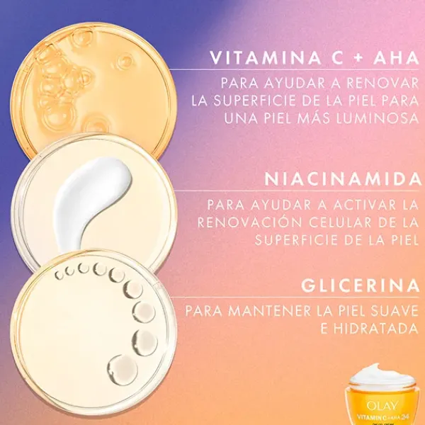 CREMA DÍA: da luminosidad a tu piel. El gel crema de día Olay Vitamin C + AHA 24 proporciona una piel más luminosa en solo 1 día y un tono y una textura visiblemente más uniformes en 14 días. Y eso no es todo: esta crema también hidrata la piel al instante durante 24 horas. Con una deliciosa fragancia cítrica y una textura ligera, esta fórmula se absorbe sin dejar sensación pegajosa ni grasa. Con una combinación de vitamina C, AHA y niacinamida, reduce visiblemente las manchas oscuras y la hiperpigmentación. Esta crema hidratante está dermatológica y clínicamente probada y no es comedogénica. También está disponible como gel crema de noche sin perfume. Solo te ofrece lo mejor, para que brilles.