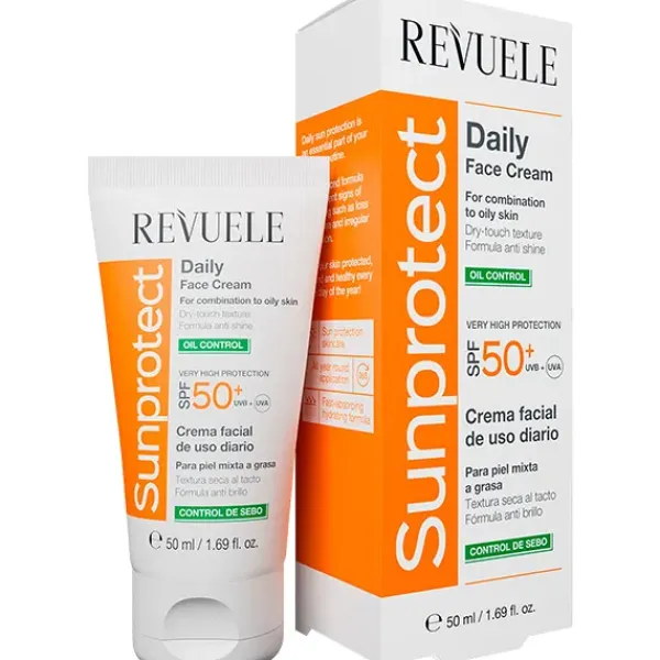 REVUELE SUNPROTECT DAILY FACE CREAM – MOISTURE BOOST, SPF 50+ proporciona una protección solar muy alta a diario y ayuda a evitar que la piel dañe los rayos UVA y UVB. Trabaja para hidratar profundamente la piel sin dejar residuos pegajosos. La fórmula suave y liviana garantiza una apariencia fresca, suave y juvenil todos los días.