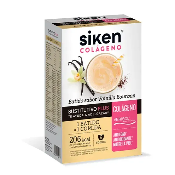 Siken Sustitutivo Plus Colágeno batido sabor vainilla bourbon es un sustitutivo ideal de una comida, para el control del peso. Su delicioso sabor a vainilla bourbon, así como su aporte en 13 vitaminas, 15 minerales y colágeno las convierten en una deliciosa forma de cuidarse por dentro y por fuera.