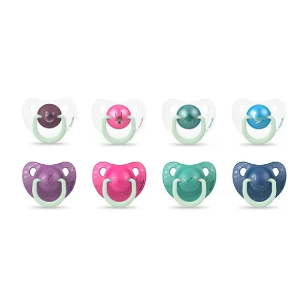 Uno de los chupetes es para el día y el otro para la noche. Tintas con efecto perlado. Destacan de manera sutil, aportando un acabado especial.