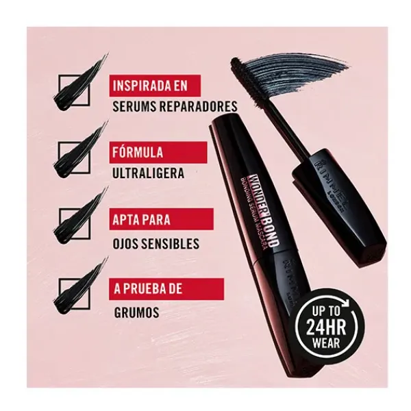 La máscara de pestañas Rimmel Wonder Bond Serum es lo último en longitud y fuerza para unas pestañas de infarto que parecen más largas. Máscara alargadora con un complejo de biotina que refuerza las estructuras de queratina. La primera máscara de pestañas con sérum de Rimmel. Consigue unas pestañas visiblemente revitalizadas en una sola pasada. Fórmula a prueba de borrones y grumos.