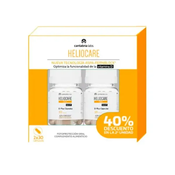 Este pack incluye 2 unidades de Heliocare 360º D Plus Cápsulas: Contiene Aspa-Fernblock®,una combinación única de extractos vegetales de Polypodium Leucotomos y Aspalathus linearis e ingredientes antioxidantes como la Vitamina E que contribuye a la protección de las células frente al daño oxidativo.