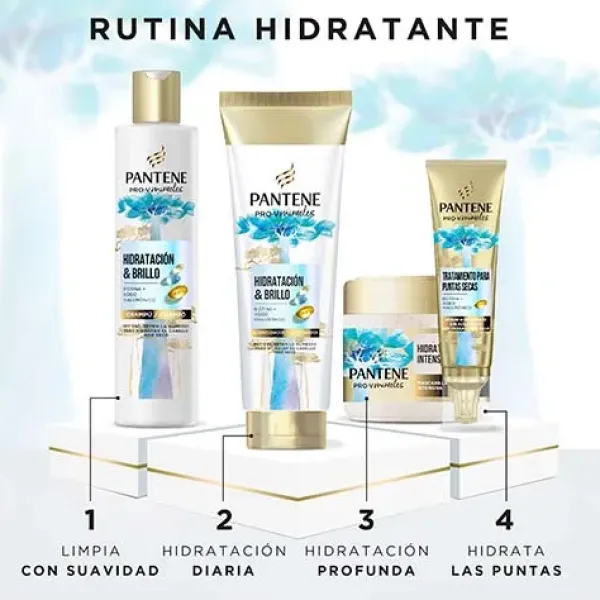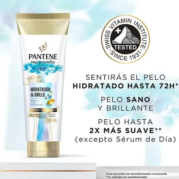 ¿Tienes el pelo seco y dañado que necesita urgentemente hidratación? El acondicionador Hidratación Y Brillo de Pantene es un hidratante capilar incomparable. Enriquecido con nutrientes Pro-V, nuestra fórmula única aporta hidratación profunda al pelo seco y apagado. Te proporcionará una suavidad y un brillo irresistibles. Apto para uso diario, el acondicionador Hidratación Y Brillo está enriquecido con ácido hialurónico y biotina para proporcionar un pelo nutrido y sano, lleno de vida y movimiento. Consigue un pelo deslumbrante con hasta 72 horas de brillo. Siéntete tu mejor versión con este práctico producto.
