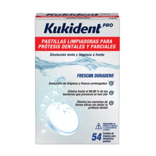 Las pastillas limpiadoras Kukident Pro Frescor Duradero eliminan las manchas de forma eficaz sin dañar la prótesis dental.