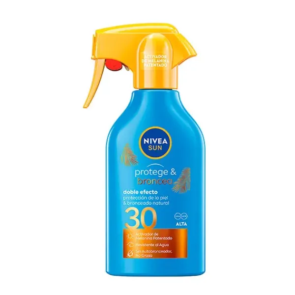 NIVEA SUN Protege & Broncea Spray Solar FP 30 proporciona protección UV inmediata y un bronceado natural de la piel gracias al extracto pro-melanina que estimula la propia melanina de la piel. Para un bronceado bonito y saludable en un cómodo formato spray de aplicación rápida. Fórmula no grasa, resistente al agua y sin autobronceador.