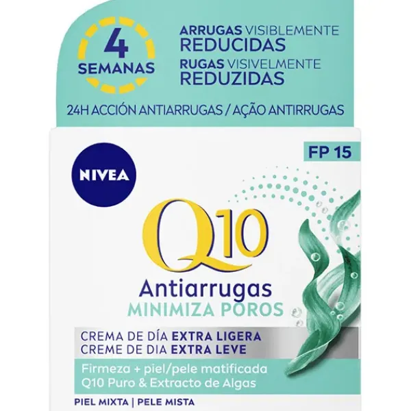 NIVEA Q10 Antiarrugas Crema de Día Antiarrugas Minimiza Poros es una crema extra ligera con Coenzima Q10 100% IDÉNTICA a la de la piel que minimiza los poros y es ideal para la piel mixta. Protege las células de la piel frente a los agresores externos y recarga la piel de energía, mejorando su regeneración*. Contiene además extracto de algas, conocido por sus propiedades antibacterianas. Su fórmula purificante de textura ligera reduce visiblemente las arrugas y reafirma la piel. En 24 horas, minimiza los poros visiblemente en un 14%**. Su FP15 protege frente a la radiación UVA/UVB, causante del envejecimiento prematuro de la piel. Dermatológicamente comprobado. No comedogénico – no obstruye los poros. in-vitro *Estudio de 2 semanas, 31 mujeres, 2019.