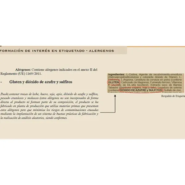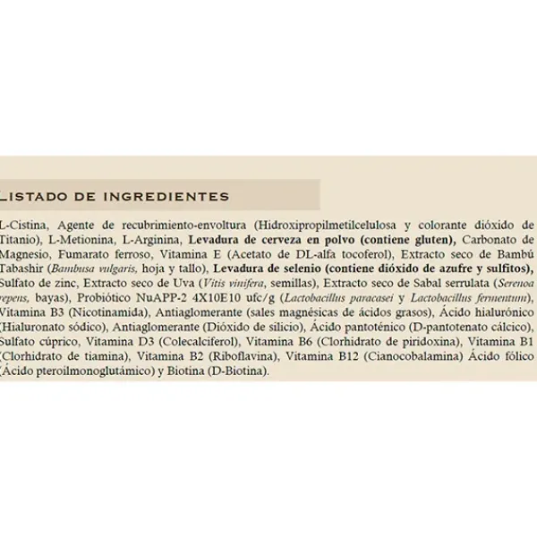 Complemento alimenticio a base de aminoácidos, levadura de cerveza, vitaminas y minerales.