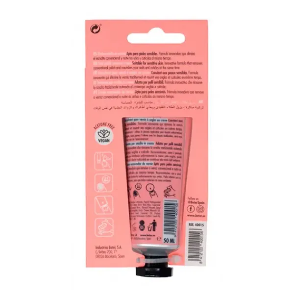 Quitaesmalte en crema con una fórmula innovadora que elimina el esmalte convencional y nutre las uñas y las cutículas.