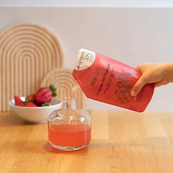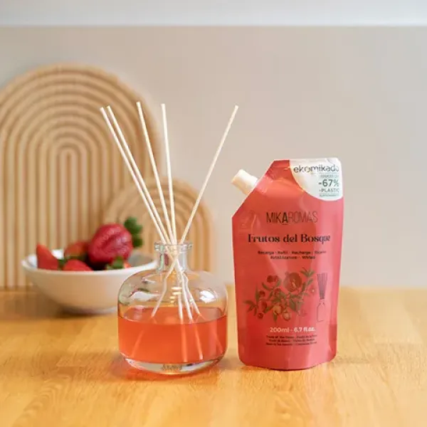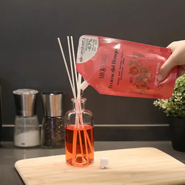 EKOMIKADO es una recarga de ambientador mikado en un formato innovador, una bolsa doypack que reduce el consumo de plástico y la huella de carbono frente a otras opciones tradicionales como los formatos de reposición en botella de plástico. Es una respuesta a tu compromiso, y el nuestro, con el consumo responsable. Permite utilizar un envase a tu elección para colocar la fragancia y está disponible en nuestros 4 aromas más vendidos.