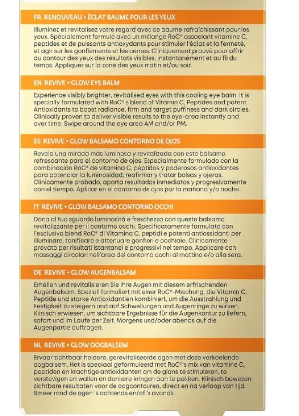 Glow Bálsamo Contorno de Ojos ilumina la mirada. Las ojeras y las bolsas se reducen visiblemente gracias al complejo pendiente de patente de Roc con vitamina C iluminadora y péptidos reafirmantes. Este stick refrescante se desliza de forma invisible con una aplicación sin contacto para unos resultados potentes: En una semana, el 96% notó una mirada más sana y en 4 semanas el contorno de ojos estaba más iluminado, con las ojeras y las bolsas visiblemente reducidas.