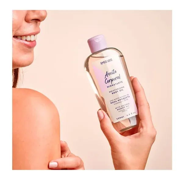 Aceite hidratante corporal formulado con aceite de almendras dulces, vitamina E y emolientes natural que le aportan las vitaminas y nutrientes necesarios para mejorar la elasticidad de la piel y protegerla de los agentes externos.
