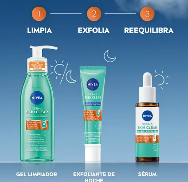 Derma Skin Clear Peeling Exfoliante de Noche: NIVEA Derma Skin Clear Peeling Exfoliante de Noche está específicamente formulado para pieles propensas a imperfecciones. Con Ácido Salicílico, Ácido Glicólico y Niacinamida. Regenera la piel tras sólo 7 días. Reduce visiblemente las imperfecciones y previene su reaparición. Clínicamente testado*.