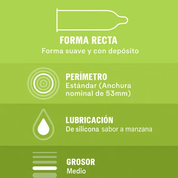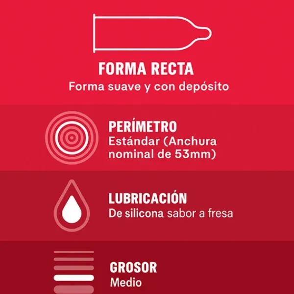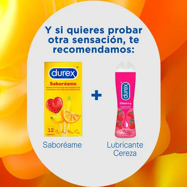Los preservativos Durex Saboréame están compuestos por preservativos sabor Fresa, Plátano, Naranja y Manzana para una diversión extra. Estos condones son lubricados y de forma recta con depósito.