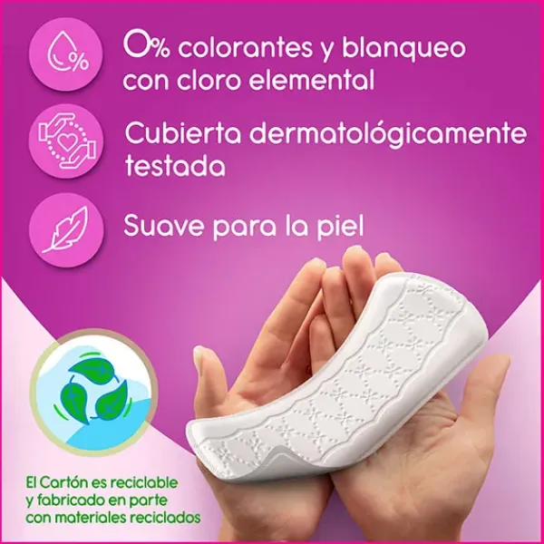 Con una nueva cobertura Tacto Suave que absorbe el flujo rápidamente y un núcleo superabsorbente que ayuda a retener la humedad al instante.