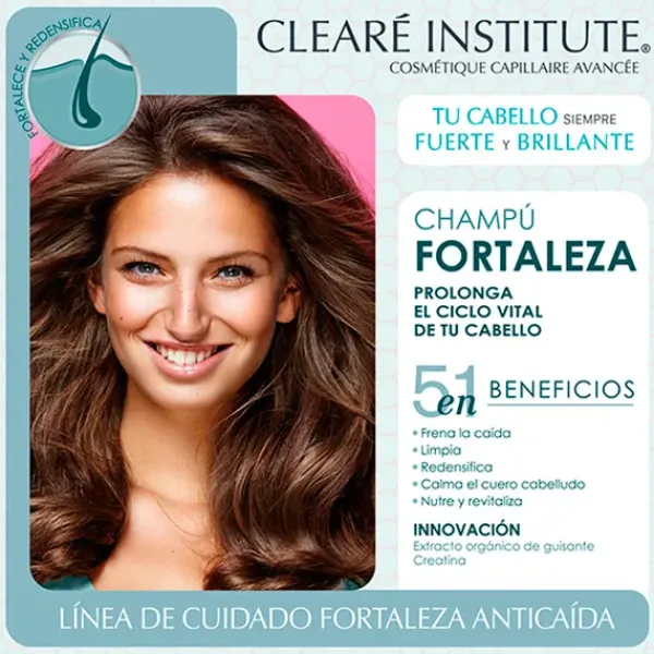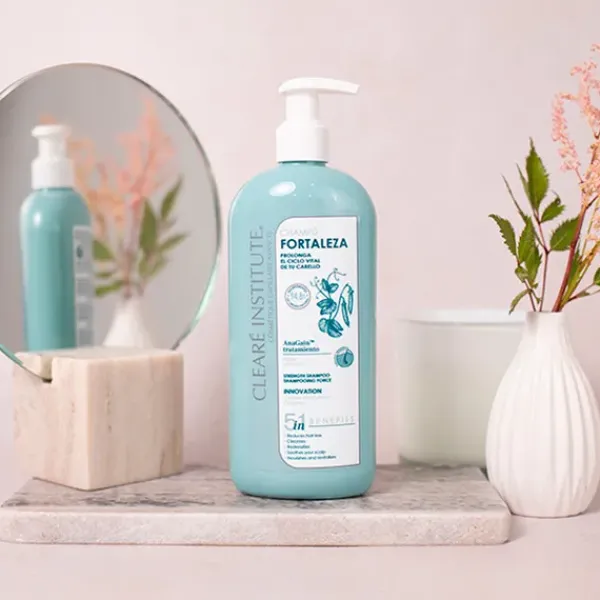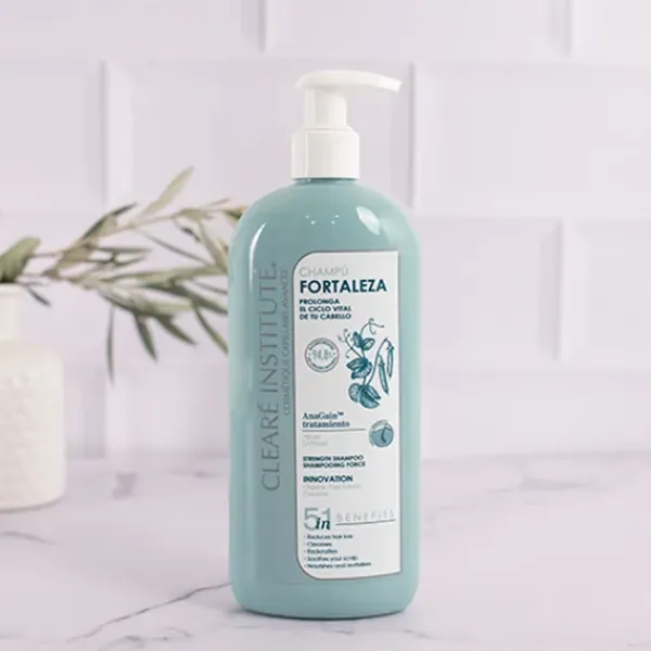 El champú fortaleza de Clearé Institute, con ingredientes naturales y ecológicos limpia, nutre y fortalece el cabello a la vez que frena la caída y estimula su crecimiento.