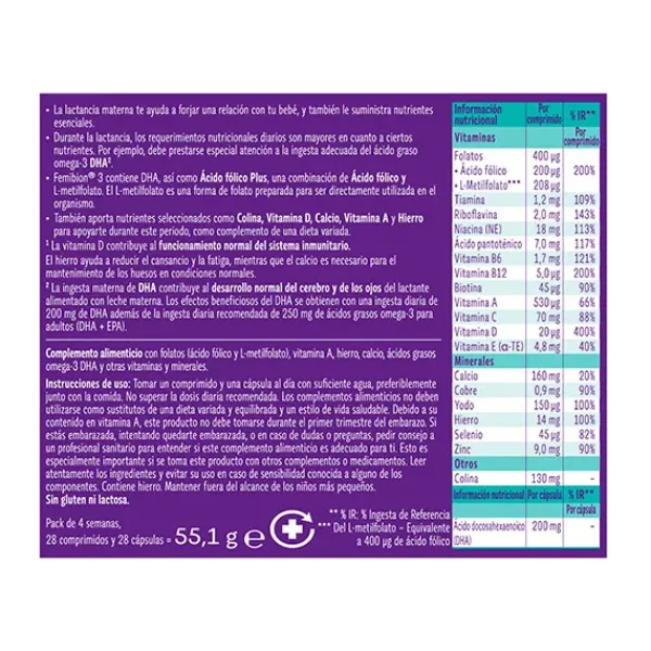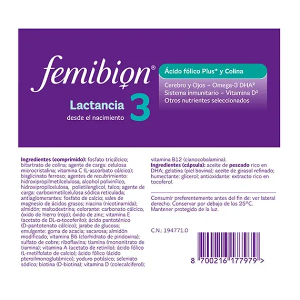 Durante la lactancia, tu bebé comienza una etapa de gran crecimiento. Para contribuir al desarrollo normal del cerebro y los ojos de tu bebé, Femibion 3 el ácido graso omega-3 DHA, además de ácido fólico plus (ácido fólico y Metafolin®)³ y Colina ¹Vitamina D contribuye al normal funcionamiento del sistema inmunitario. ²