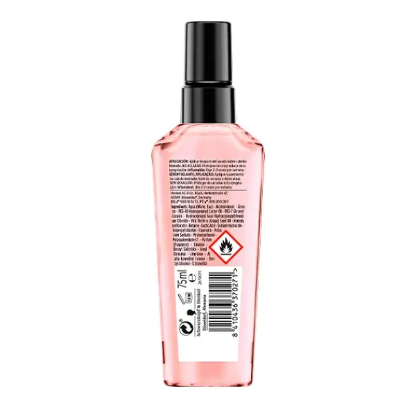 Sérum con tecnología split hair miracle compuesta de complejo iónico y aceite de semilla de uva que repara las puntas abiertas y se mantiene tras lavado.