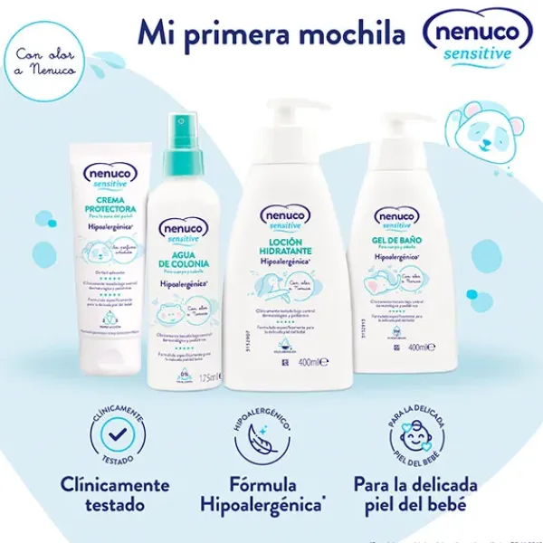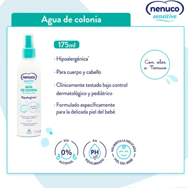 - Agua de Colonia Nenuco Sensitive 175ml: Con olor a Nenuco, el agua de colonia de Nenuco Sensitive es adecuada para cuerpo y cabello. Hipoalergénica y sin alcohol. Tiene un pH equilibrado y no irrita la delicada piel del bebé. No apto para niños menores de 3 meses.
