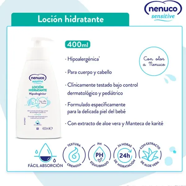 - Loción Hidratante Nenuco 400ml: Con olor a Nenuco, el gel de baño de Nenuco Sensitive tiene una textura cremosa y de fácil absorción. Contiene extracto de Aloe Vera y de Manteca de Karité. Tiene un pH equilibrado y es hipoalergénica*. Proporciona 24 horas de hidratación a la piel de tu bebé con la loción hidratante de Nenuco Sensitive. No apto para niños menores de 3 meses.
