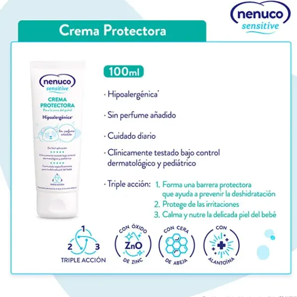 - Crema Protectora para la zona del pañal Nenuco Sensitive 100ml: Protege la piel de tu bebé gracias a tu triple acción. Forma una barrera protectora que ayuda a prevenir la deshidratación, protege de las irritaciones y calma y nutre la delicada piel del bebé. Hipoalergénica y sin perfume añadido.